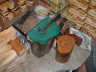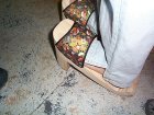 陳:現今木屐的雛型都是由中、南部(員林、豐原、嘉義)生產運來,再由店裡加工製作完成。而材料則選用山黃麻為主,因為它不怕水、不會腐爛、不怕蟲蛀、會吸腳氣,可治療香港腳。