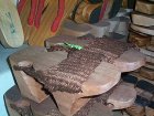 李: 從前木材的來源都是從觀音山或八里地區產出,有山麻、棡木兩種,經由砍柴、鋸木……,全手工完成;過了不久,就向南部訂購雛型,再由自己手工完成,原因有兩點:一、南部人設計了機器來大量生產木屐雛型,生產快速,剛開始的成品為方形木屐,後來經過改良後,可生產出一體成形又美觀的木屐粗胚。二、南部木材多,大部分為芒果樹;而現今,也都直接向台南縣訂購木屐粗胚。